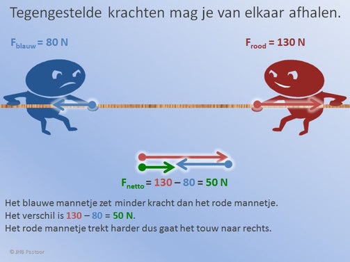 Als twee(of meer) krachten dezelfde kant op gaan mag je ze bij elkaar optellen. De som van deze krachten noem je nettokracht. Als er twee(of meer) krachten de tegenovergestelde kant op werken, trek je ze van elkaar af. Hier is de nettokracht het verschil tussen beiden krachten.